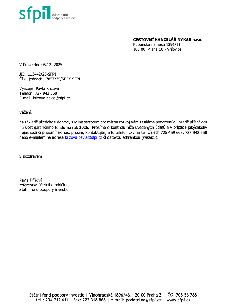 POJIŠTĚNÍ PROTI ÚPADKU CK (zahrnuto v ceně zájezdu):